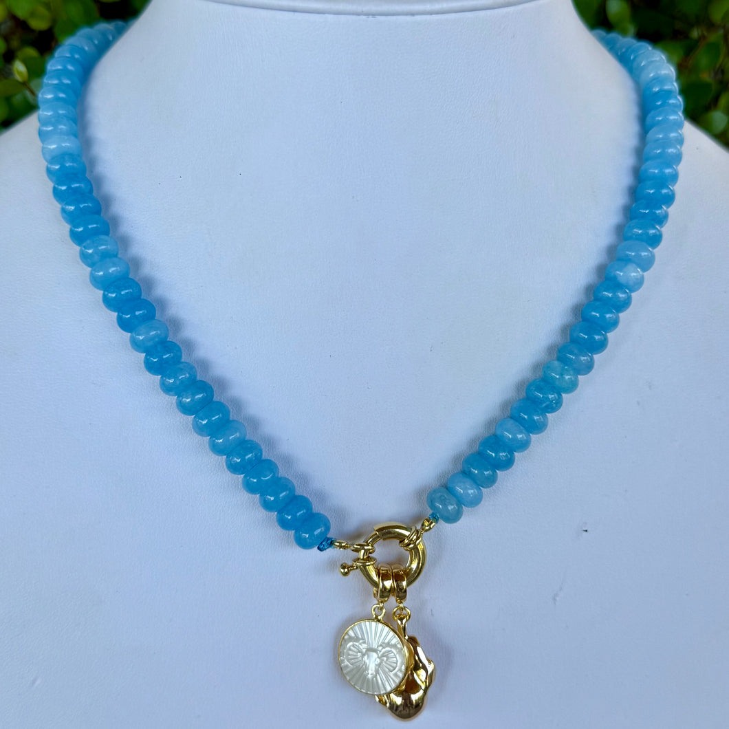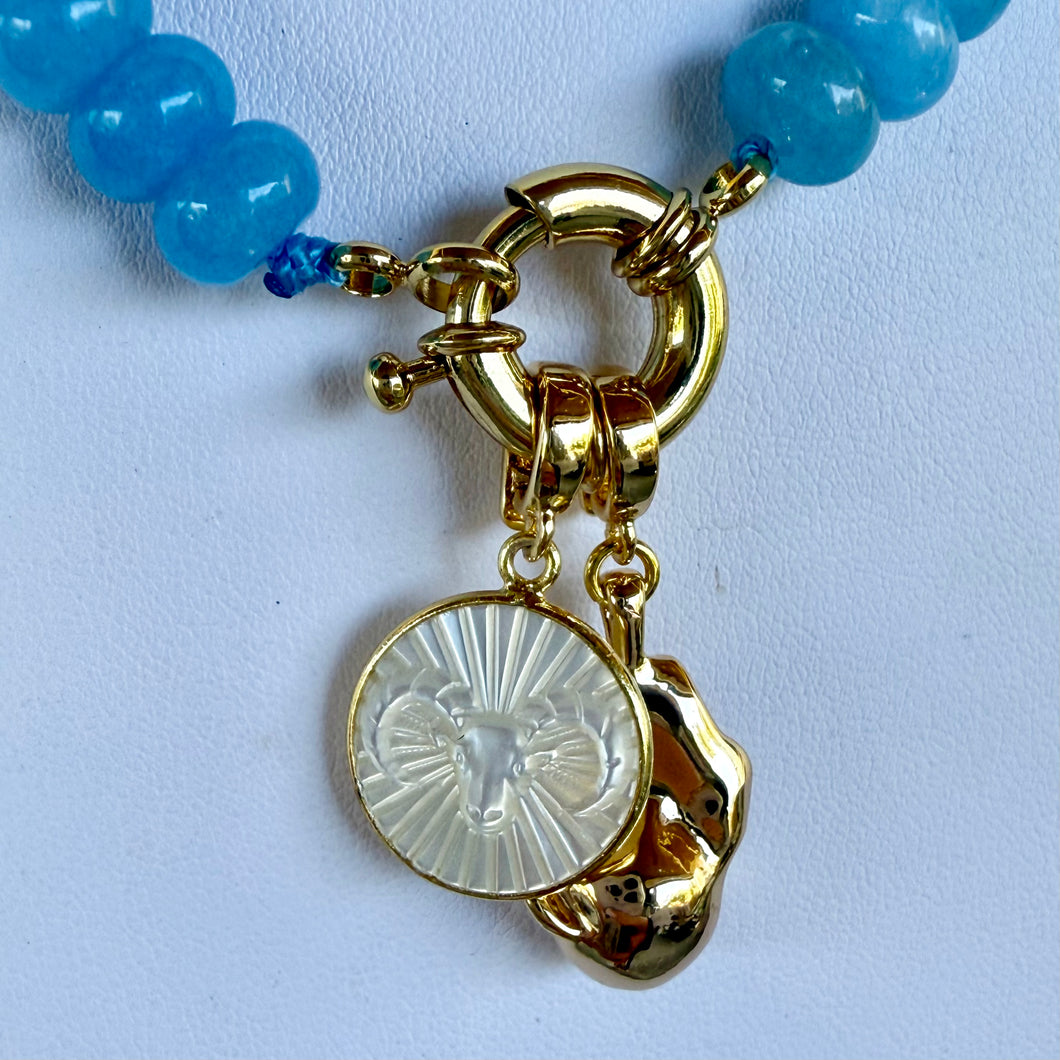 Hand carved ram gemstone pendant + gold accent pendant on a blue beaded strand with a gold spring ring clasp