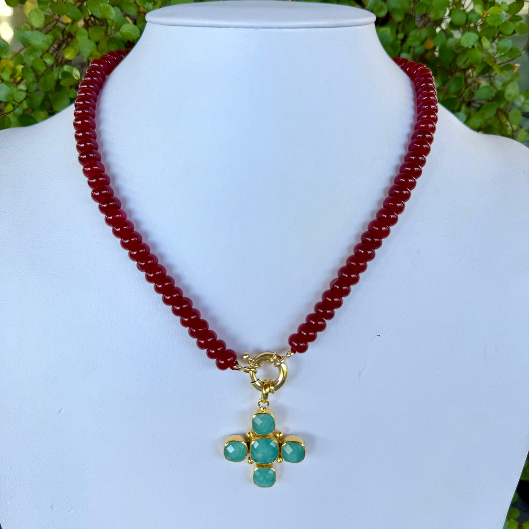 Labradorite cross pendant on assorted beaded strands with a gold spring ring clasp